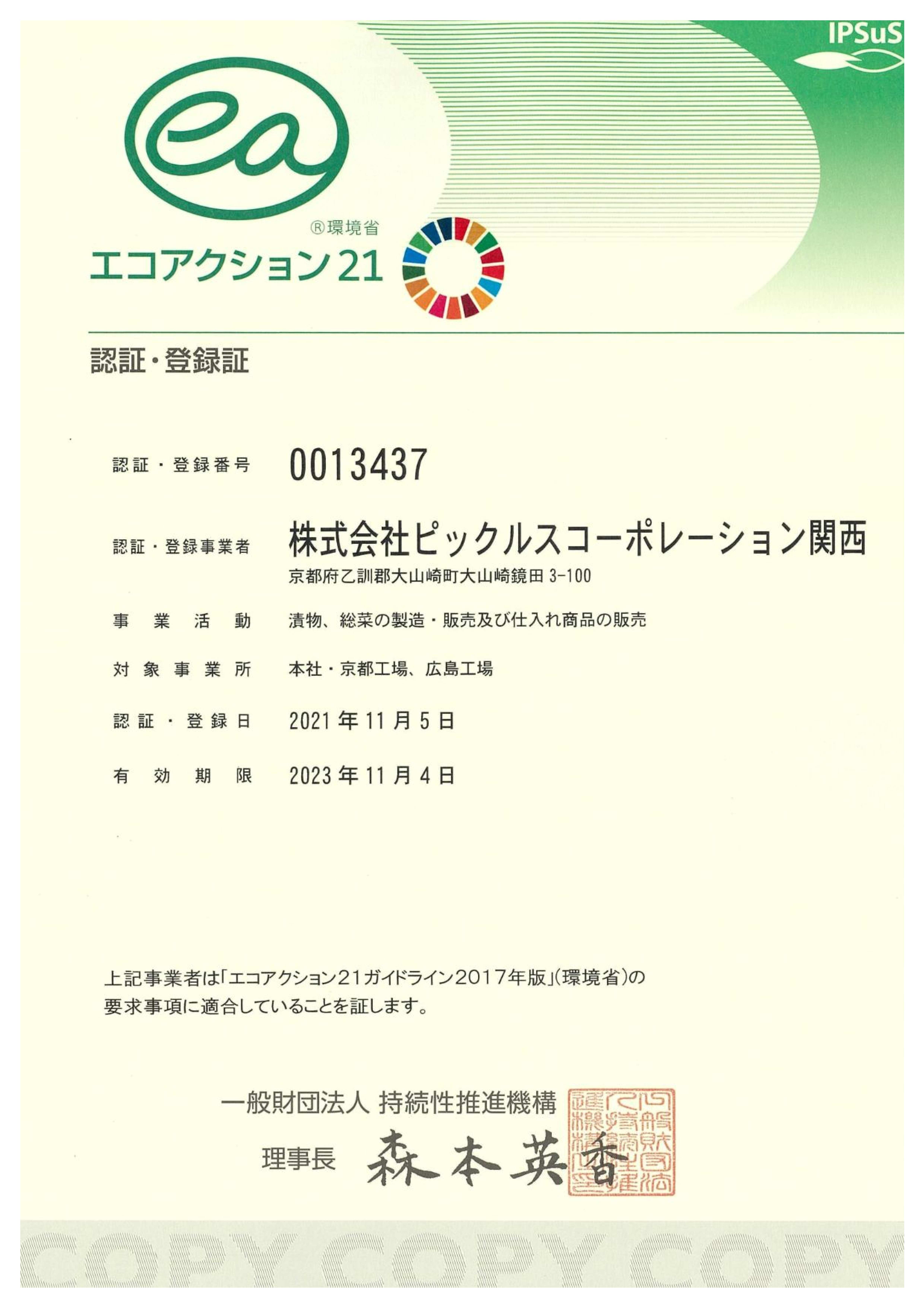 当社の子会社である株式会社ピックルスコーポレーション関西(本店所在地:京都府乙訓郡大山崎町)は、エコアクション21の認証を取得しました。エコアクション21のガイドラインに則り、環境配慮に対する取り組みを推進し、持続可能な社会の構築に貢献してまいります。